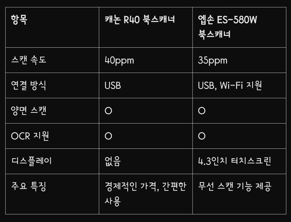 엡손 ES-580W 북스캐너는 엡손에서 출시한 경쟁 모델로, 캐논 R40과 유사한 기능을 갖추고 있지만 차이점이 존재합니다. 다음 표를 통해 비교해 보겠습니다.
