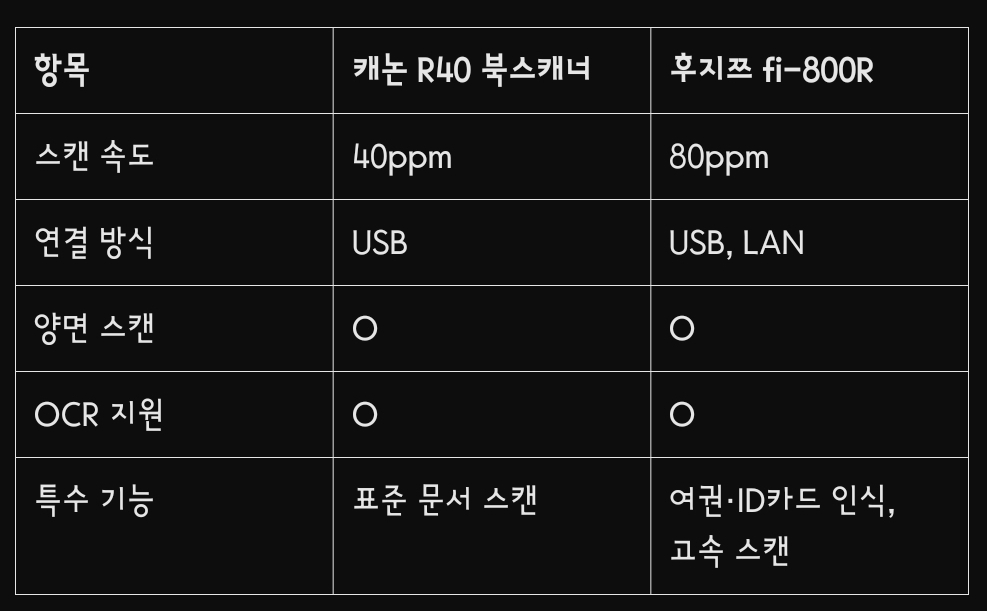 후지쯔의 제품은 주로 대기업, 공공기관 등에서 사용되는 고성능 제품으로, 일반적인 사무용으로는 다소 과한 성능을 제공합니다. 반면, 캐논 R40 북스캐너는 가격 대비 성능이 우수하며, 중소기업과 개인 사용자가 활용하기에 적합한 제품입니다.