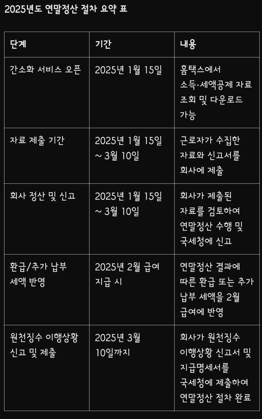 2025년 연말정산은 다음과 같은 일정으로 진행됩니다.