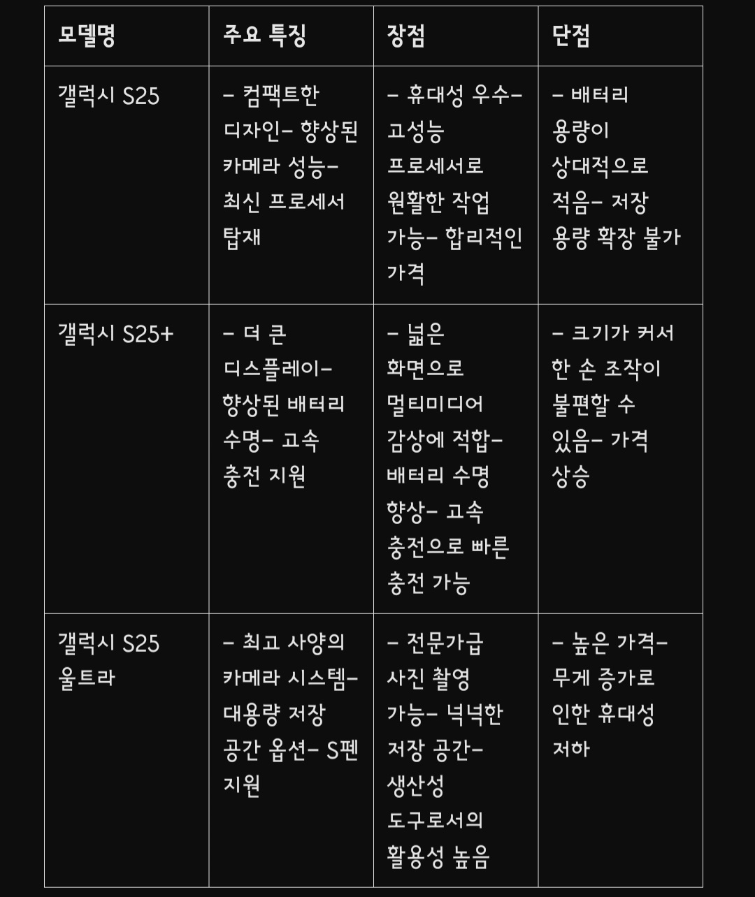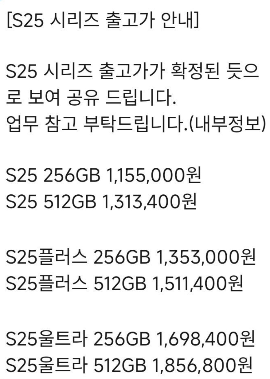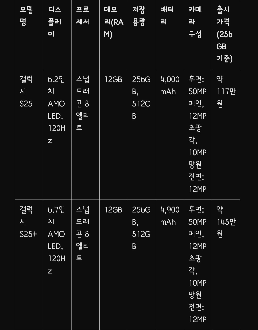1.갤럭시 S25 시리즈 사양 및 출시 가격(예상)