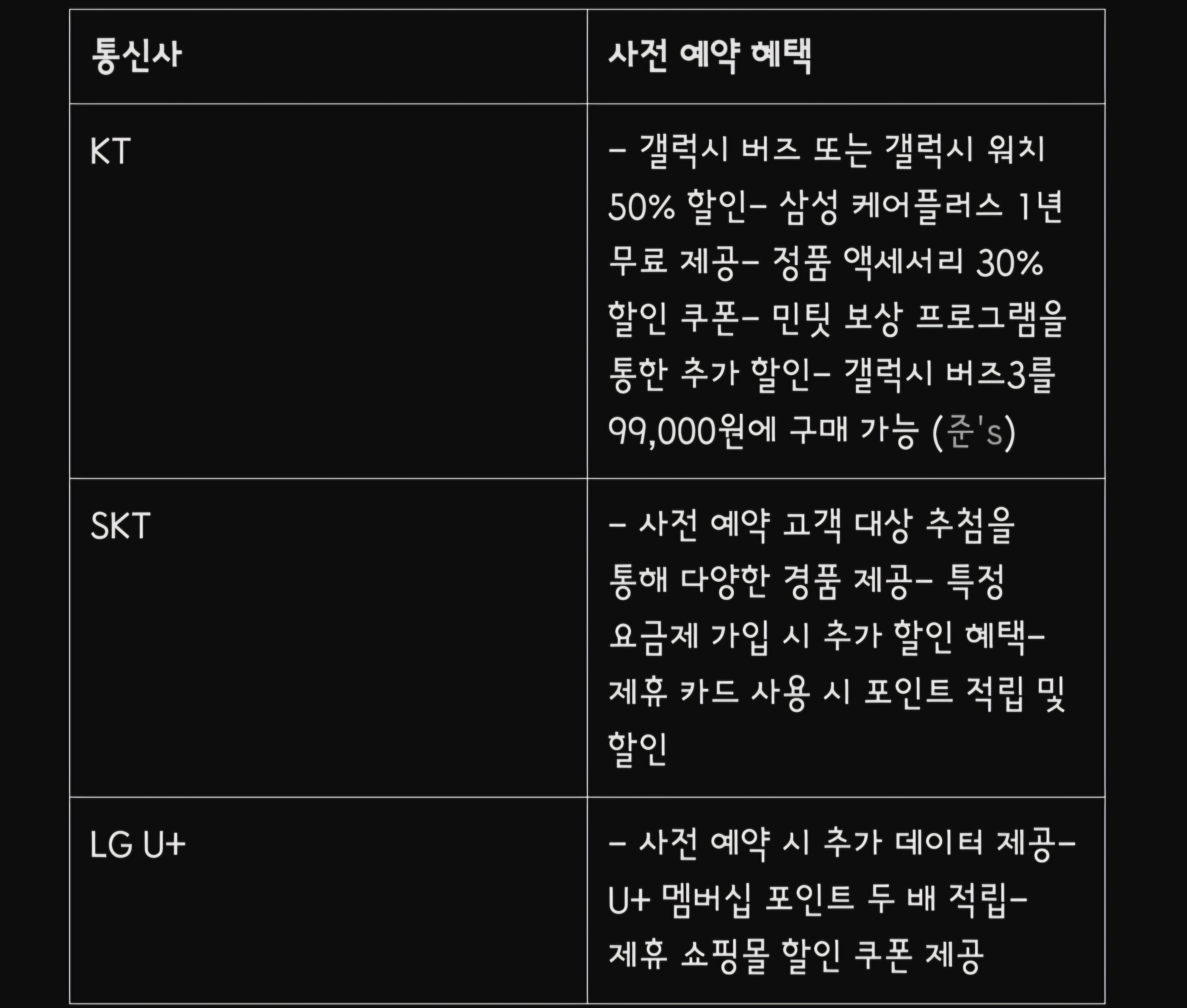 또한, 통신사별로 제공되는 다양한 사전 예약 혜택을 통해 더욱 합리적인 구매가 가능하오니 통신사 홈페이지 및 기타 매체를 통해 다양한 혜택을 받아보시기 바랍니다.