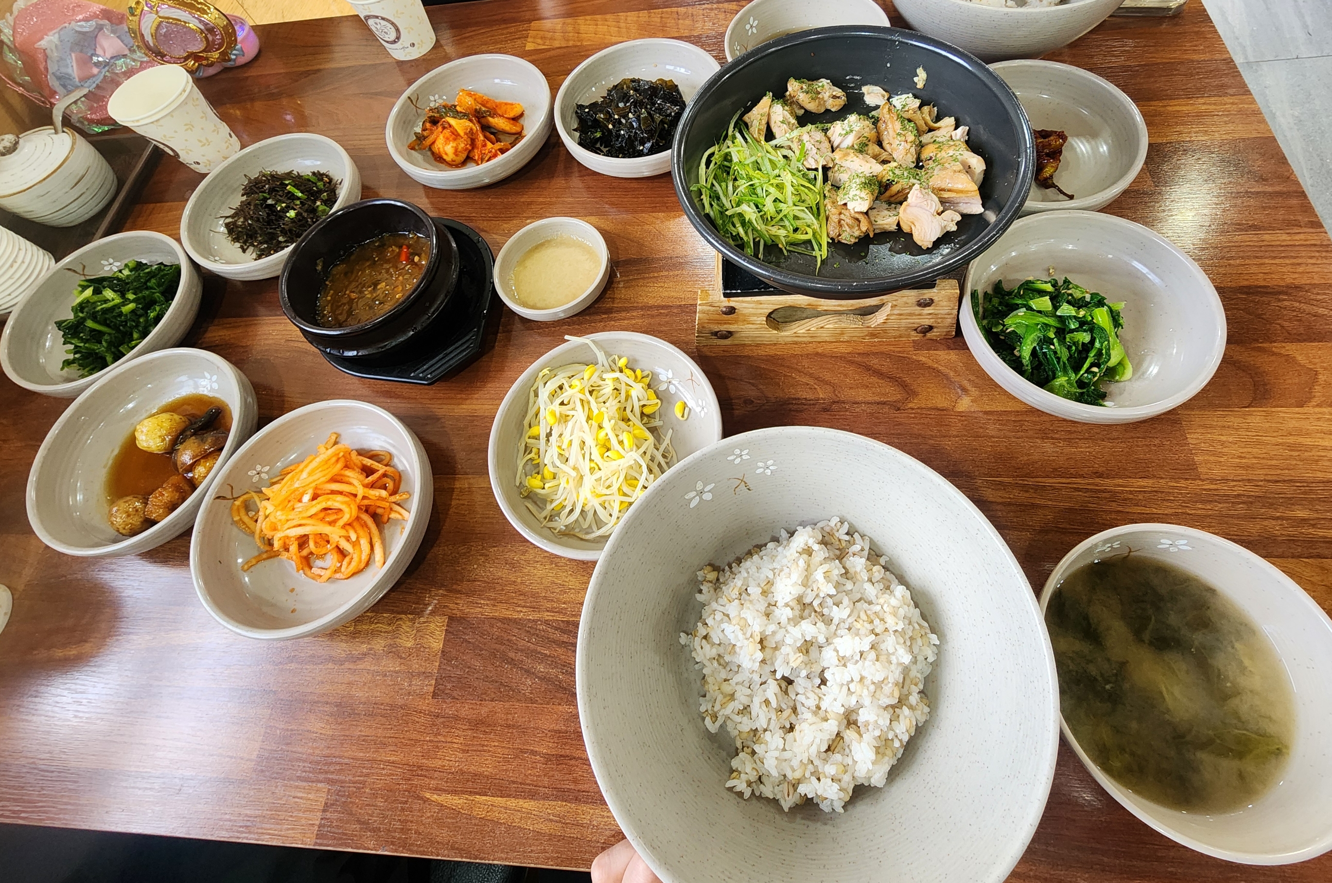 여러 나물과 감자조림, 고추지, 닭갈비? 슴슴한 된장국 및 양념장? 열무김치 등 다양한 재료가 신선함을 유지하고 있었네요.